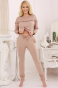 Górę zestawu stanowi bluzka z długimi rękawami, zakończonymi dopasowującym ściągaczem. Jej największym atutem jest subtelna i kobieca falbanka, wykonana z miękkiej wiskozy w tym samym, stonowanym kolorze. Ten gustowny dodatek nadaje całej piżamie wyjątkowego charakteru i szyku.