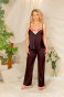 Wykonany z delikatnej, miękkiej satyny, która zmysłowo otula ciało przy każdym, nawet najmniejszym ruchu. Gładka koszulka z kontrastową wstawką zmysłowo podkreśla linię dekoltu a regulowane naramki pozwalają decydować o jego głębokości. Długie, szersze a dzięki temu bardziej stylowe, satynowe spodnie zostały wykończone kontrastowym mankietem aby idealnie współgrać z topem.